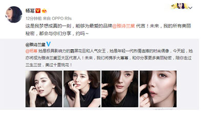 今天(2月20日),著名國(guó)際美妝大牌雅詩(shī)蘭黛在官方微博上公開(kāi)了自己的全新代言人——楊冪。據(jù)明星代言部所知,由楊冪出鏡的代言廣告宣傳照將于近日在各個(gè)渠道放出,不久,大家就可以看到滿大街的楊冪啦!