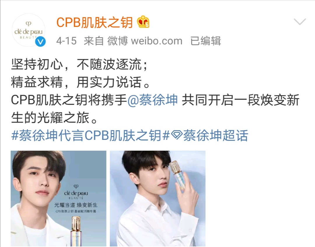 CPB肌膚之鑰作為一線高端護(hù)膚品選擇蔡徐坤作為亞太區(qū)品牌代言人也算得上是強(qiáng)強(qiáng)聯(lián)合了!