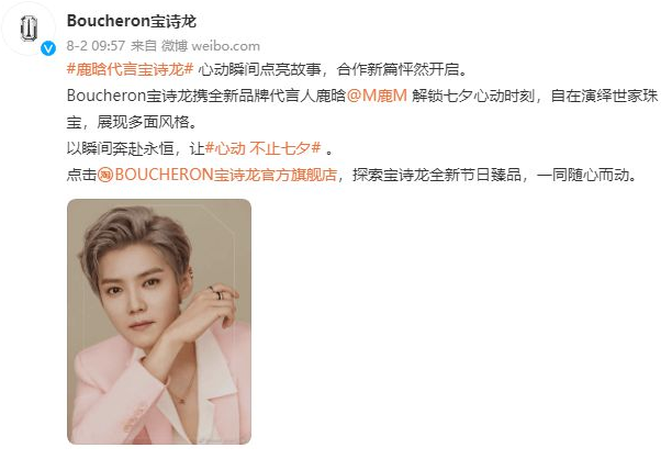 8月2日,寶詩龍官宣鹿晗成為品牌代言人,也是寶詩龍創(chuàng)立以來的全球首位男性代言人,大家都知道,頂奢品牌在選擇代言人的時(shí)候,看重的不僅僅是流量,更要考慮明星藝人的國(guó)際影響力、商業(yè)價(jià)值、形象氣質(zhì)、專業(yè)素養(yǎng)、人品道德等多方面因素。